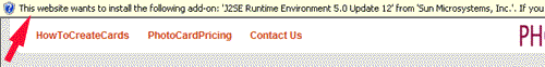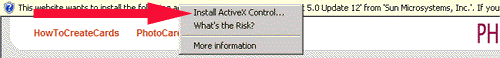 Microsoft Windows Security Warnings:- Your operating system may block the download of a Java update that is required to run the "Photo Card Center". If this occurs, you will see a warning window just below the Internet Explorer address bar that looks like this: