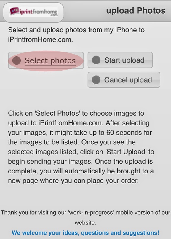 To get started, go to iPrintfromHome.com from any web browser on your phone. You will automatically be directed to the mobile version of our site. If you are a new user, click on "New User" to create an account. If you already have an account, click on "Existing Customers" where you will be directed to log in. Once you have logged in or created an account, follow these steps to upload your images: