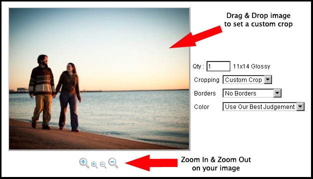 You can now crop your images to your exact specifications while placing your order at iPrintfromHome.com. Using the zoom buttons along with drag & drop functionality, you can set your own custom crop and preview the changes in real time.