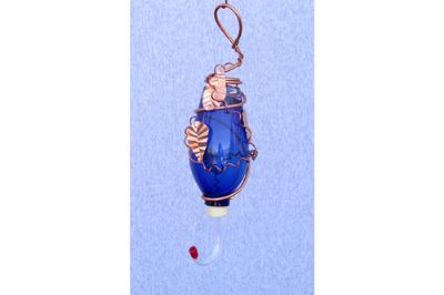 Many years as a professional wireman translated to a collection of “found” glass containers of all shapes and sizes recycled with copper wire and hand cut and formed copper accents. Miles of wire later Bill and Terrie began showing their creations in Central Missouri as Ozarklake Distinct Décor. These glass and copper feeders include the “vacuum” type and a delicate tube feeder arrangement with multiple feeding stations. Ozarklake feeders now hang in gardens and on decks across Missouri and from California to Tennessee. They also decorate country kitchens and garden windows as distinctive indoor décor. . Each is a unique one-of-a-kind item that accents the glass it was in a former life.